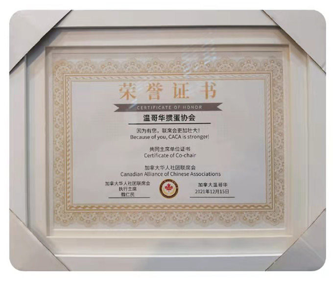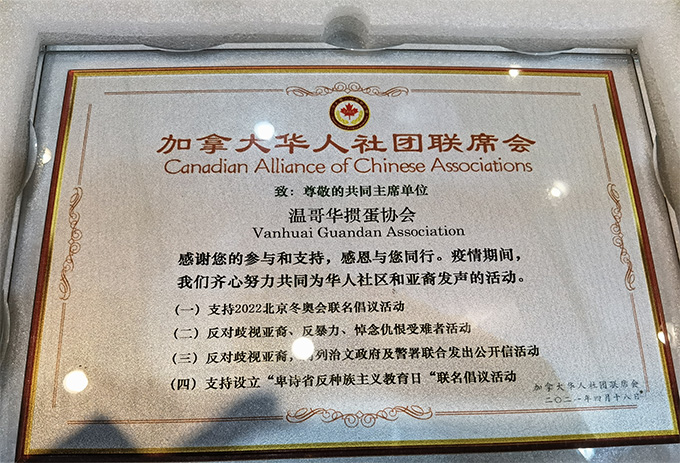 加拿大华人社团联席会给温哥华掼蛋协会颁发荣