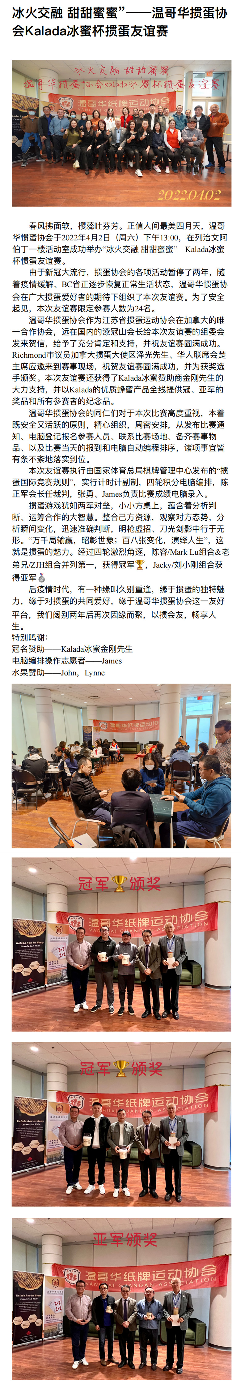 冰⽕交融 甜甜蜜蜜”——温哥华掼蛋协会Kalada冰