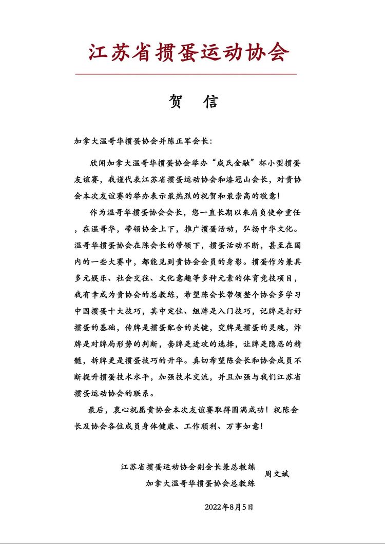 温哥华掼蛋协会作为江苏省掼蛋运动协会在加拿大的唯一合作协会,远在国内的江苏省掼蛋运动协会副会长兼总教练周文斌先生给本次友谊赛的组委会发来贺信,阐述了掼蛋技巧的精髓,并祝友谊赛圆满成功。