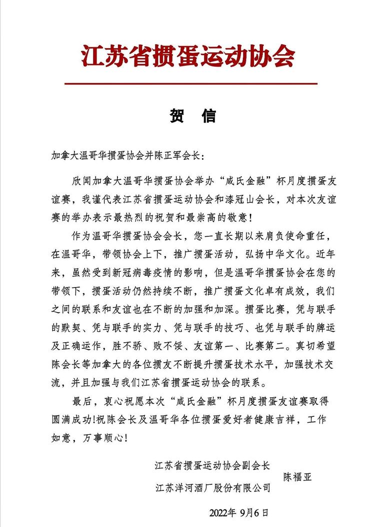 温哥华掼蛋协会成立以来,一直得到江苏省掼蛋运动协会的关注和支持,远在国内的江苏省掼蛋运动协会副会长、江苏洋河酒厂股份有限公司陈福亚书记给本次友谊赛的组委会发来贺信,祝友谊赛圆满成功,并赞助了全部奖项的奖品和所有参赛人员的纪念品。