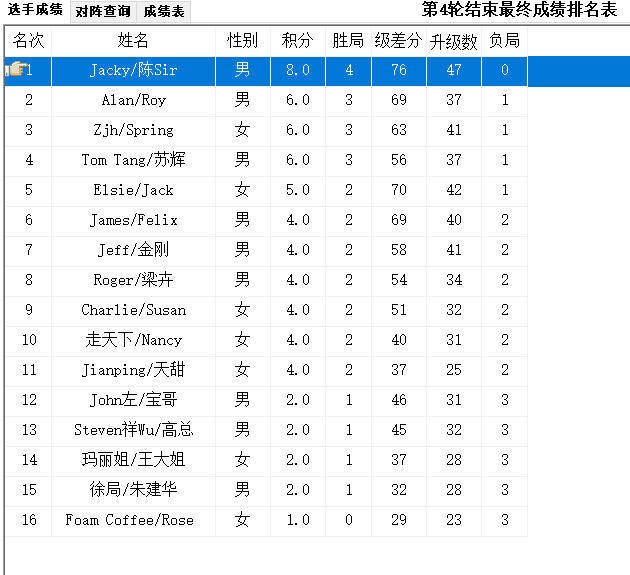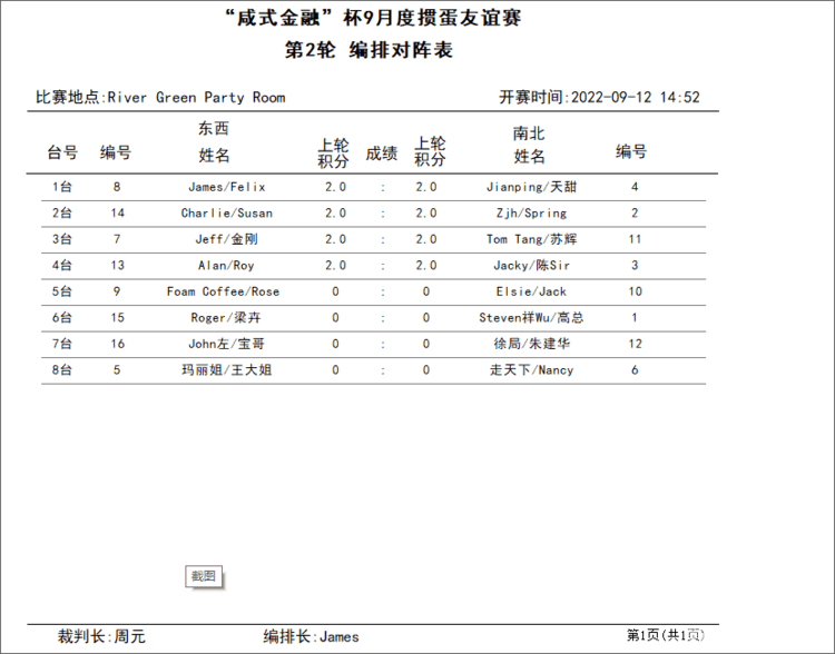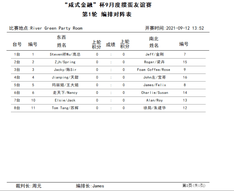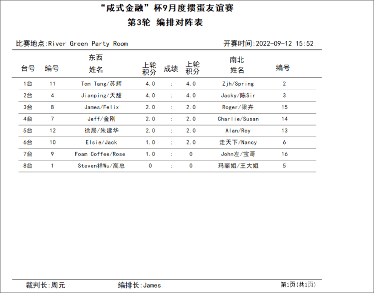 本次友谊赛执行由国家体育总局棋牌管理中心发布的“掼蛋国际竞赛规则”,实行计时计副制,四轮积分电脑编排,周元副会长任裁判,James负责比赛成绩电脑录入。