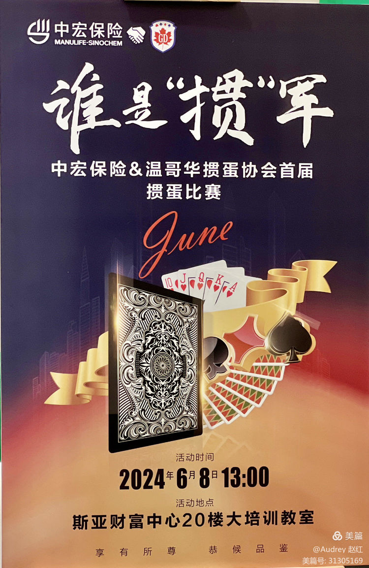 2024年6月8日下午13:00,“谁是掼军”中宏保险&温哥华掼蛋协会首届掼蛋比赛于斯亚财富中心成功举办。本次活动由中宏保险策划主办、温哥华掼蛋协会协办,共计40位掼蛋爱好者报名参赛,牌开10桌,同场竞技,争夺“掼军”。南京市掼蛋协会执行会长冯晓慈先生、温哥华掼蛋协会会长陈正军先生、中宏保险江苏分公司副总经理徐翔先生均到场为本次赛事活动致辞,祝赛事圆满成功、参赛选手们获得好成绩。