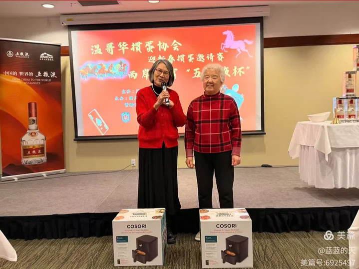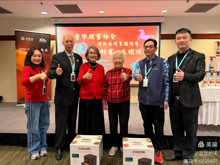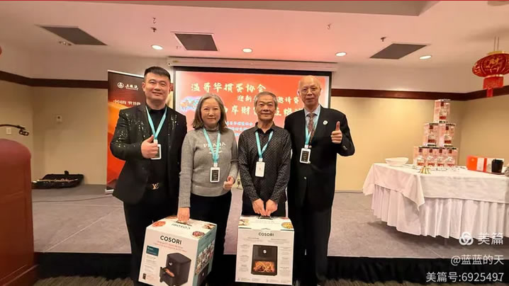 晚宴环节,协会对2025年度10位先进会员(詹建华、俞涛、玛丽姐、柳海等)颁发了荣誉证书,特别为陈幼芳、于秀敏两位长者授予“青春上进奖”,彰显“老有所乐、与时俱进”的精神。多次抽奖环节中,COSORI空气炸锅、阿拉斯加湾海鲜礼盒等大奖接连送出,欢呼声此起彼伏。